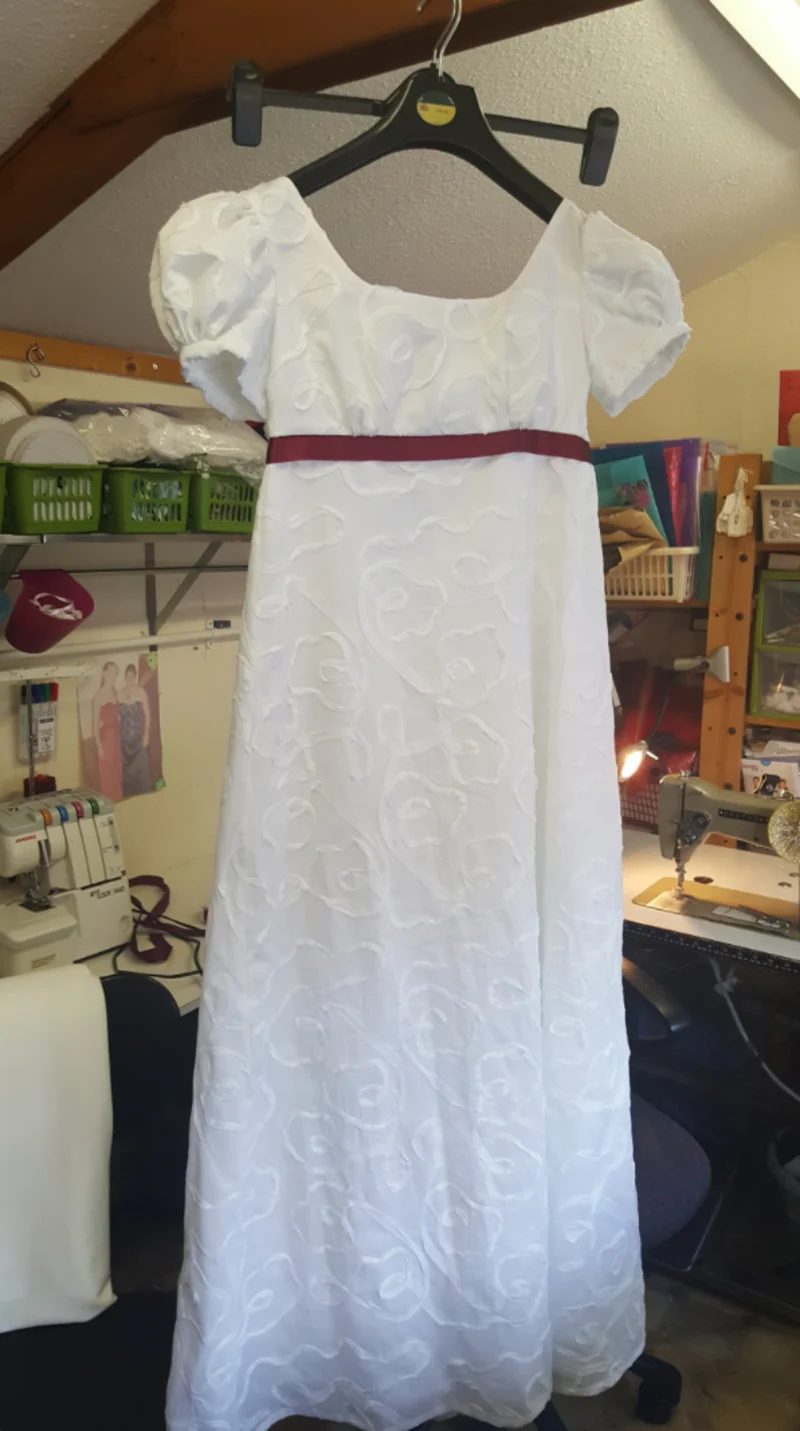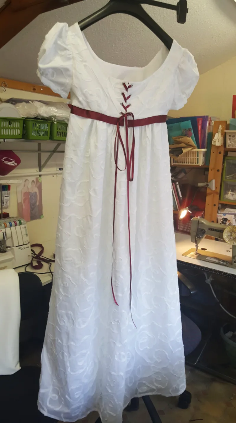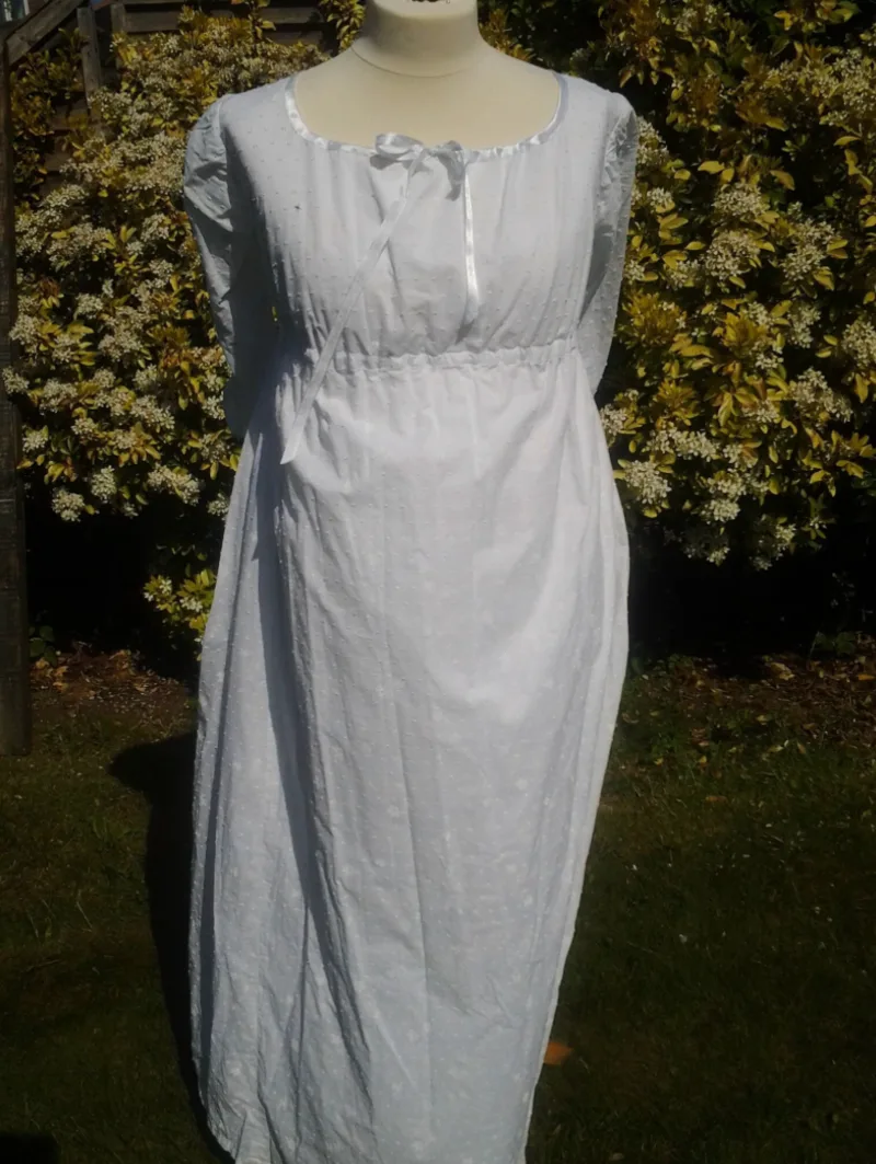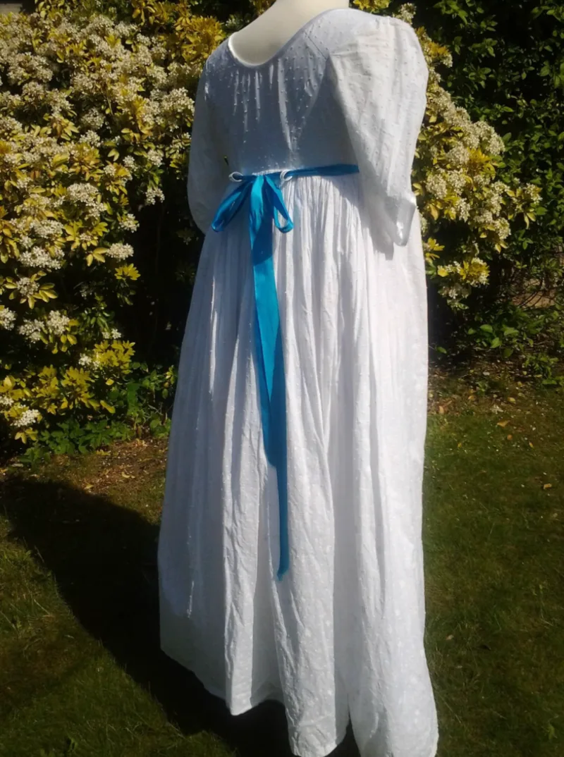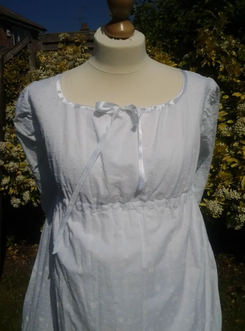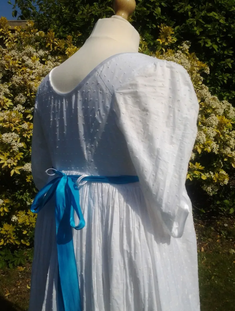 This lovely Regency dress has a drawstring at the neckline and under the bust.